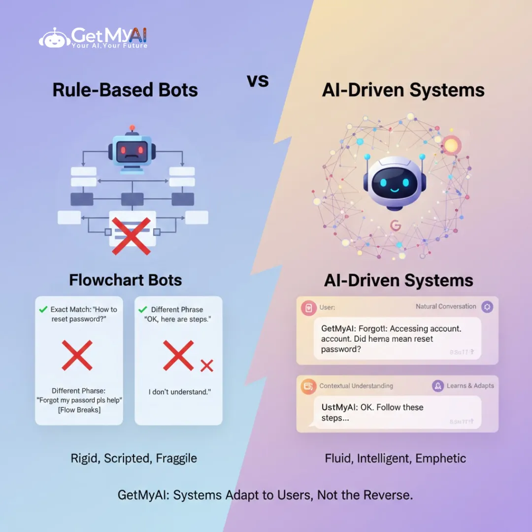 The difference becomes clearer over time. With rule-based bots, users adjust their language to please the system. With AI-driven systems, the system adapts to the user. One forces structure. The other supports conversation.