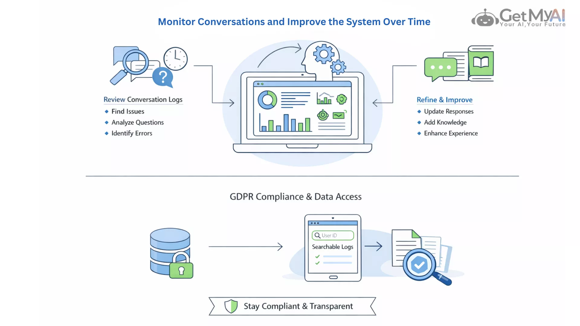 Regular monitoring of chatbot conversations helps organizations improve answers, stay compliant with GDPR rules, and respond quickly to data access requests.