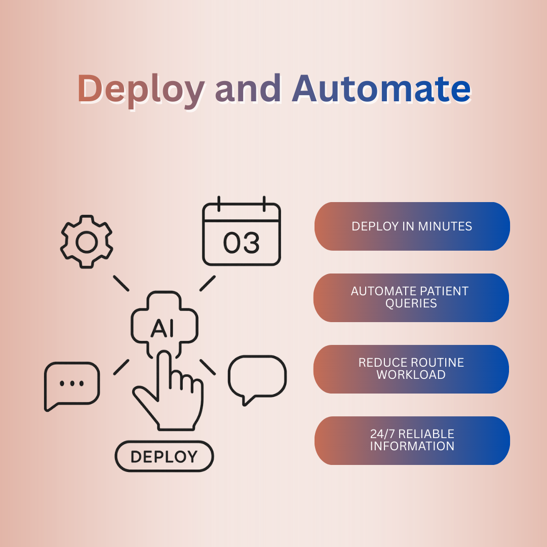 Whether you need an AI chatbot for patient enquiries or an AI support bot for clinics and hospitals, the platform gives you a simple and secure way to serve patients at any hour and across every channel.